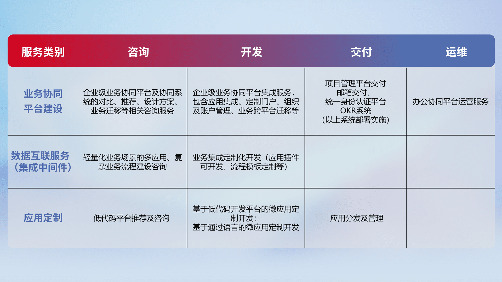 针对钉钉、、企微、、、、IDaas等平台级产品提供产品的规划、、、方案、、、交付、、、定制化开发等服务,,实现如统一协同办公、、、、智能客户服务、、、、混合会议管理、、智能数据查询、、、等业务场景,,,实现数字化转型。。。