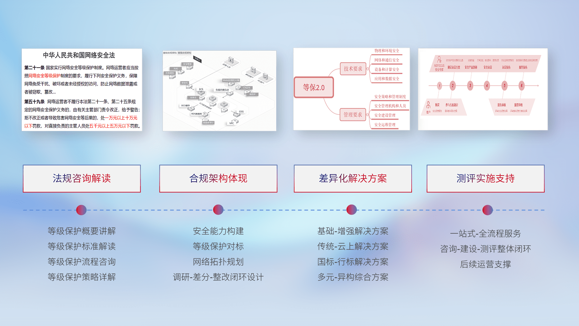 通过专业的法律咨询解读、、、合规架构体现、、、差异化解决方案、、、、测试实施支持等服务,,为客户量身打造等保合规体系。。。。